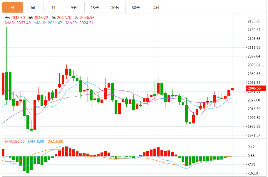 现货黄金周四收盘上涨9.96美元,涨幅0.49%,收报2044.09美元/盎司。