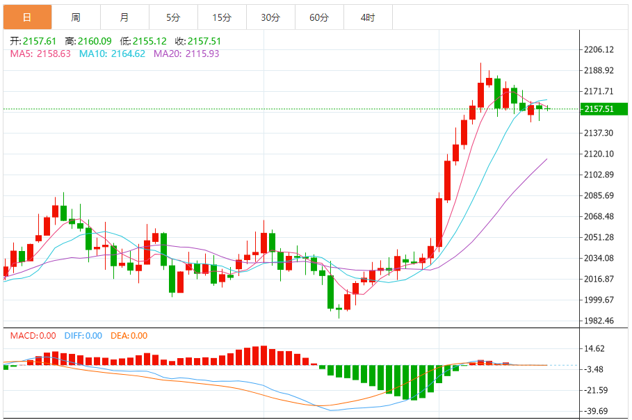 周三(3月20日),现货黄金目前位于2157.09美元/盎司附近,跌幅为0.01%。