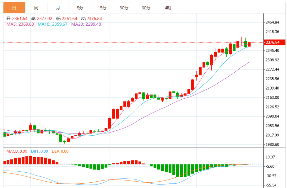 预计,今日金价交投将于支撑位2360.00美元/盎司以及阻力位2400.00美元/盎司之间。