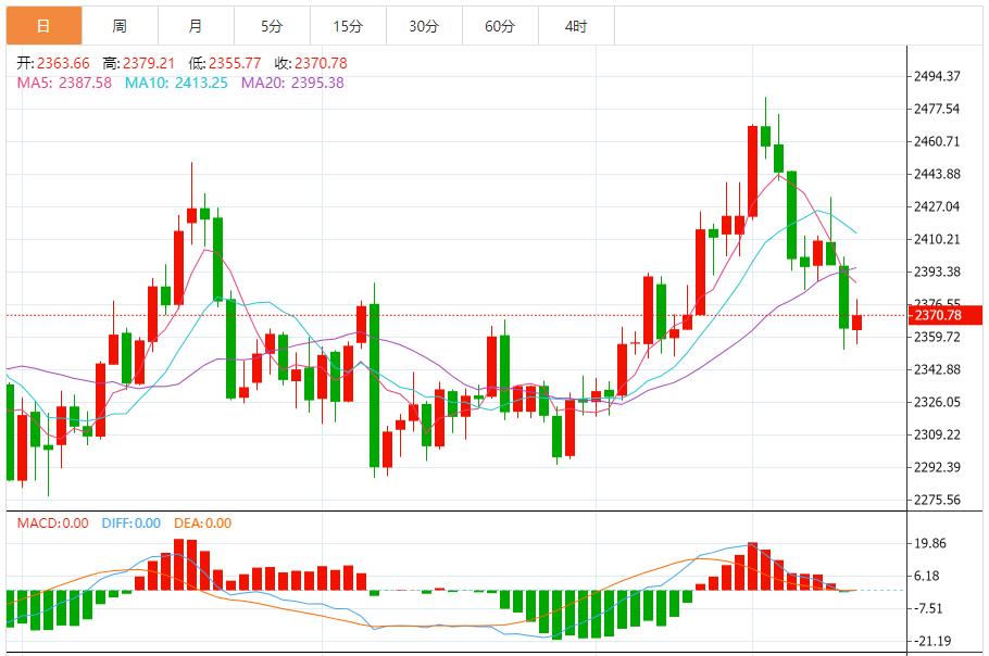 现货黄金周四收盘暴跌32.61美元,跌幅1.36%,报2364.25美元/盎司。