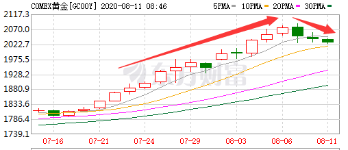 在8月6日创下历史新高后,过去两个交易日COMEX黄金期货主力合约一路下跌,截至10日20时,其报价在2040.93美元/盎司附近,逐步远离历史高点。