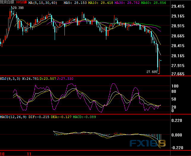 随着金价大跌,白银也遭受抛售。现货白银周二亚市尾盘一度跌破28美元/盎司,最低触及27.68美元/盎司,日内重挫4.00%。