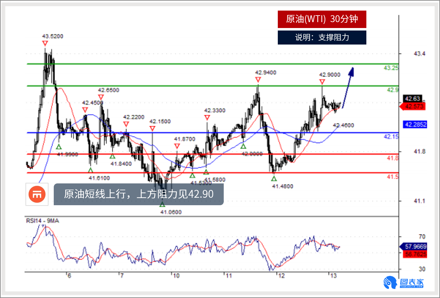 备选策略:在42.15下,看空,目标价位定在41.80,然后为41.50。