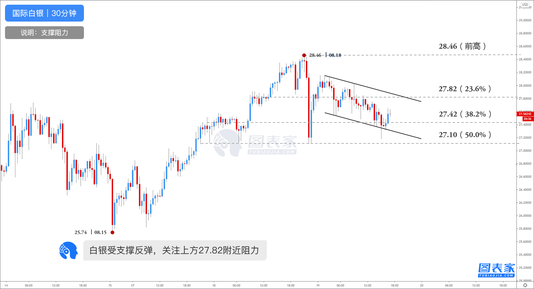 若银价下行,下方较近支撑位为斐波那契38.2%回调位27.42,跌破后盘中或将再度测试通道下轨与斐波那契50.0%回调位27.10组成支撑区间。
