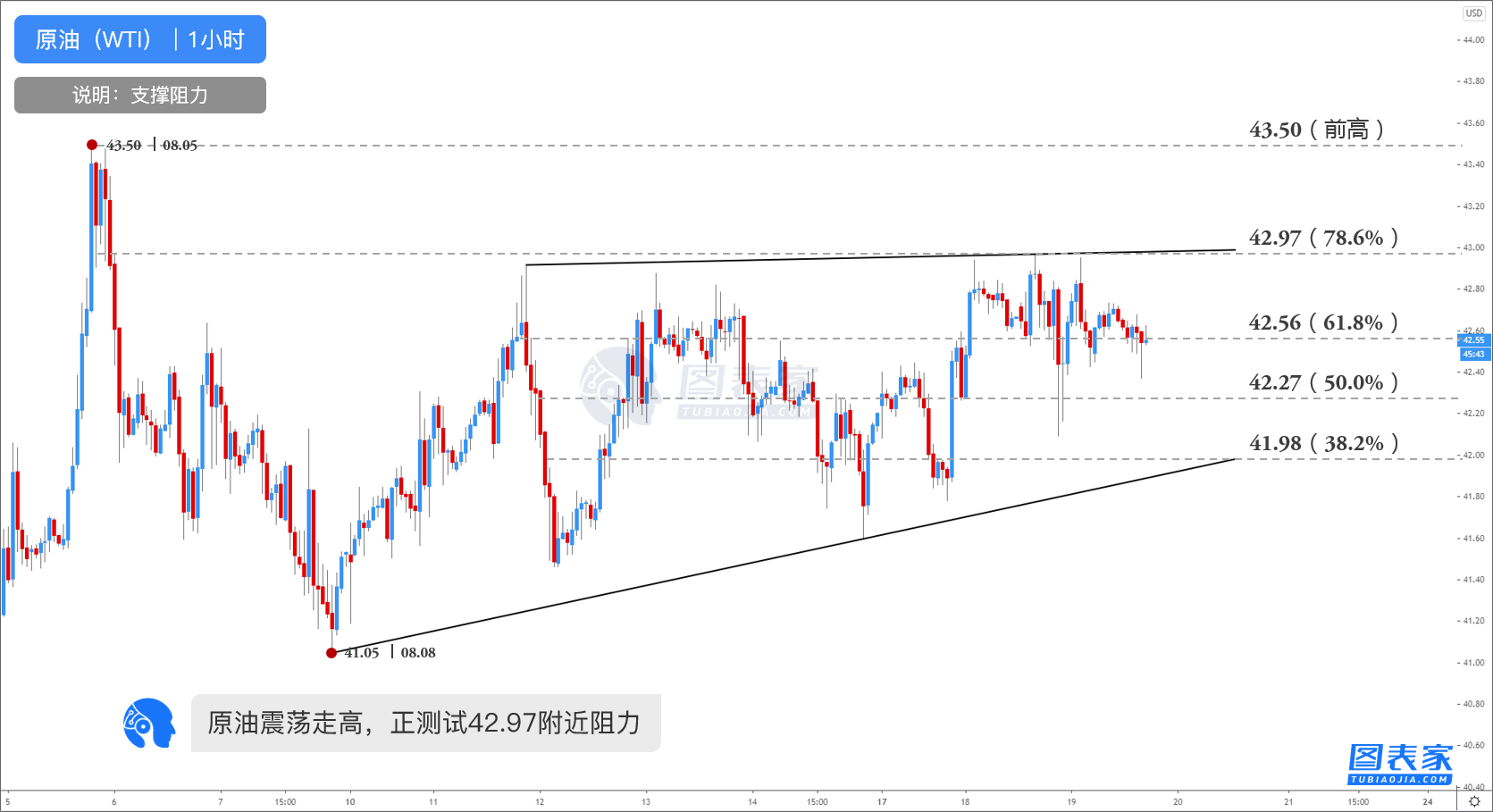 若油价上行,短线或再次测试42.97附近阻力,突破后进一步阻力位见前高43.50.