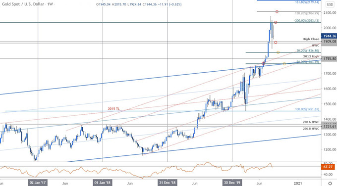 黄金价格上行突破后目标看向200%斐波延展位2033,进入8月,黄金价格最高触及2075随后掉头下行,周线收盘录得2035,进一步凸显了该区间阻力的重要性。