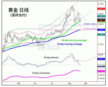 从34天周期来看,在峰值出现前就已经出现技术性背离,随后价格出现急剧回调,黄金下跌至近期低点1874.20.
