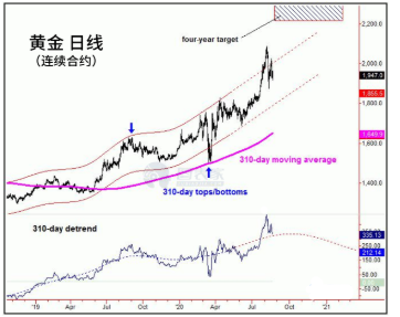 综上所示,黄金将在本月末继续下行,在完成当前修正后将开启新一轮上涨行情,310天周期目标暗示黄金或在年底涨至2212.00-2340.56。