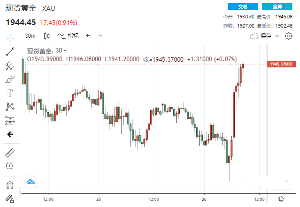 现货黄金自日低1902.48美元/盎司迅速拉升近44美元,刷新日高至1946.08美元/盎司。