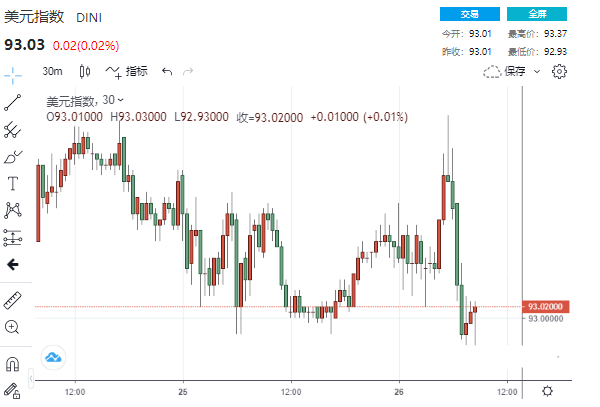美市盘中,美元指数在触及日高93.37之后大幅回落至93关口略上方,几乎回吐了全部涨幅