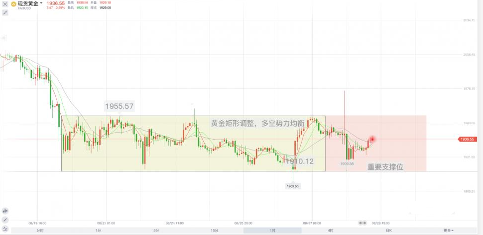 虽然周四鲍威尔的讲话,对金价走势产生了剧烈冲击,黄金一度冲破目前的矩形整理区间,但价格走势并未保持下去,金价很快回吐涨幅并快速下跌,在试探昨日提及的支撑位1910美元附近后,向上反弹并逐渐收复跌幅,日内金价已经回归到昨日剧烈波动前的1938美元附近。黄金维持盘整状态,下方支撑位继续关注箱体底部1910美元附近,上方阻力位关注箱体顶部1955美元附近。