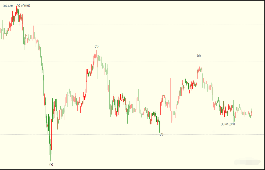小时图上看,金价似乎已在1916美元结束自1993美元开启的下行(e)浪走势,(e)浪是自2075美元开启的调整((iv))浪的子浪。((iv))浪呈现(a)(b)(c)(d)(e)五子浪震荡收敛楔形形态。
