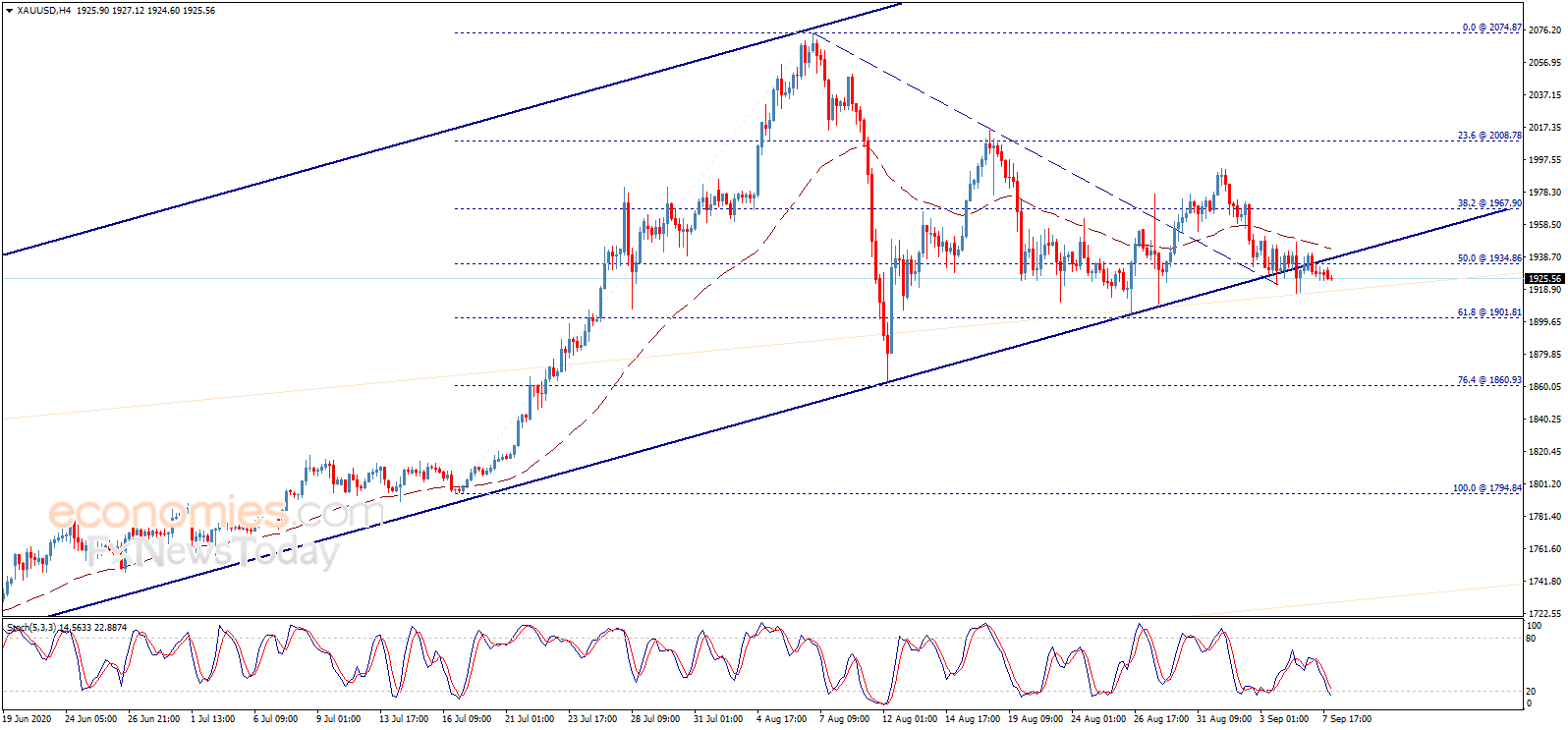 金价昨日收盘位于1934.86美元/盎司下方,这可能令金价在未来几个交易日承受看空压力,料测试首个主要目标1901.80美元/盎司。