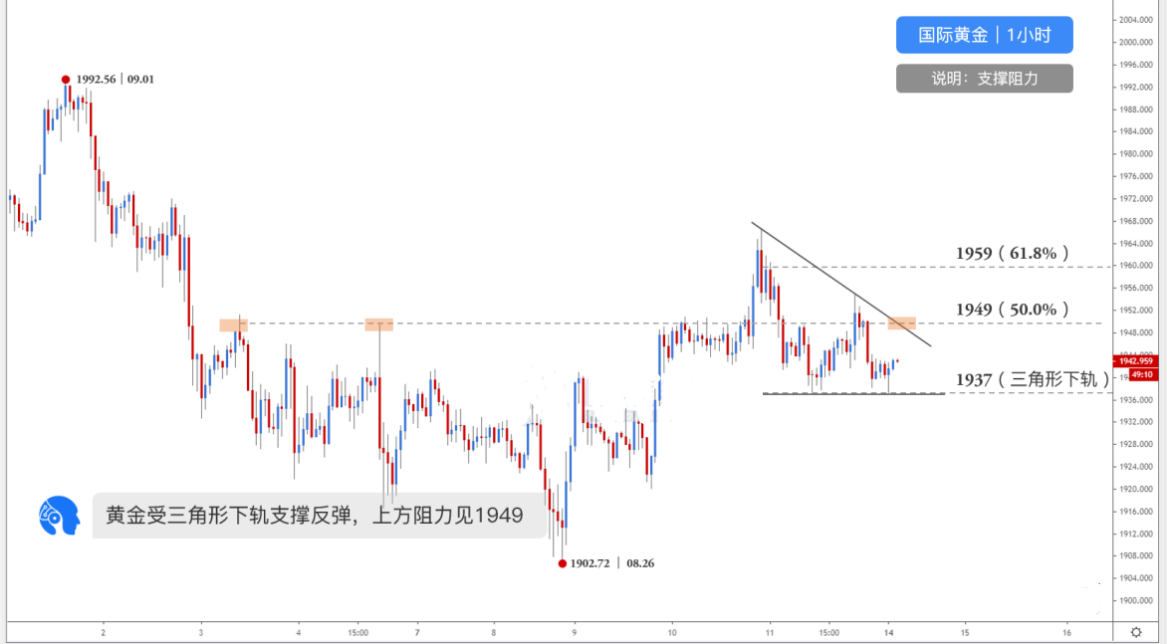 图为黄金1小时走势,价格测试三角形下轨1937附近支撑反弹,上方关键阻力见斐波那契50%回调位1949、前高以及三角形上轨组成的共振阻力,突破该阻力则见斐波那契61.8%回调位1959。