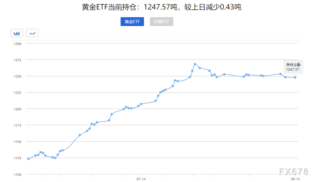 9月16日黄金ETFs数据显示,截止9月15日全球最大的黄金ETF-SPDR Gold Trust的黄金持仓量1247.57吨,较上一交易日减少0.43吨。