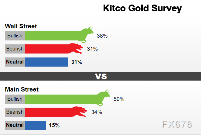 KITCO黄金市场调查的数据显示,华尔街人士对于本周黄金的走势分歧明显,看涨、看跌和中性立场的人数相当,凸显在不确定性之前,市场情绪胶着,但是需警惕这可能反而会引发更多的美元买盘。