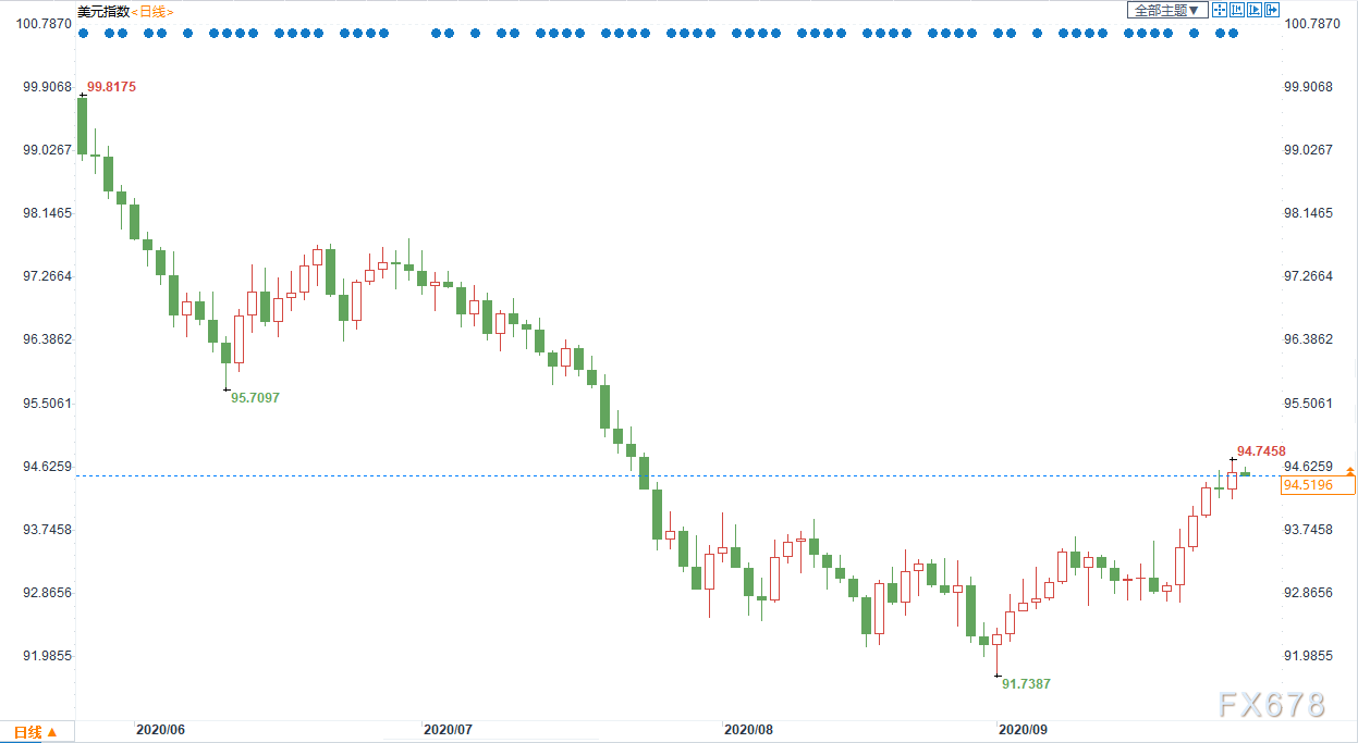 上周五(9月25日)美元上扬,录得4月初以来最大单周涨幅,因投资者担心经济复苏放缓、欧洲疫情感染上升、美国刺激计划的不确定性以及即将到来的美国大选。