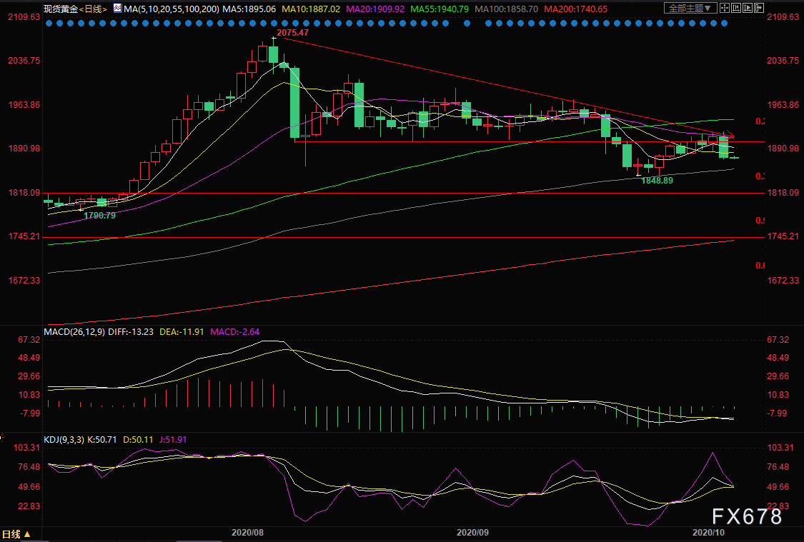 周三(10月7日)亚市盘初,现货黄金徘徊于一周低位,目前交投于1877.91美元/盎司附近,特朗普在出院后,无视美联储主席鲍威尔等官员对财政刺激的呼吁,意外叫停了与民主党的新一轮刺激方案的谈判,美国股市从一个月高位回落,收跌1.4%,美元的避险买需推高美元指数,金价则大幅跳水,回落至1900关口下方,创一周新低至1874.87美元/盎司。