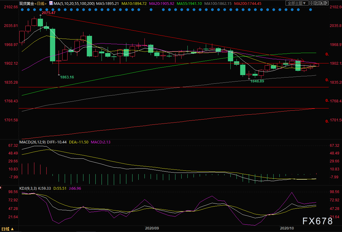 但特朗普没有透露更多的细节,仍有投资者对大选前出炉新一轮刺激方案持怀疑态度,黄金涨势仍然受限。整体来看,金价暂时仍处于震荡走势,区间参考1872-1920,若能顶破该区间,或将为短线进一步方向提供指引,另外2075以来下行趋势线1905.89位置阻力需要重点关注。