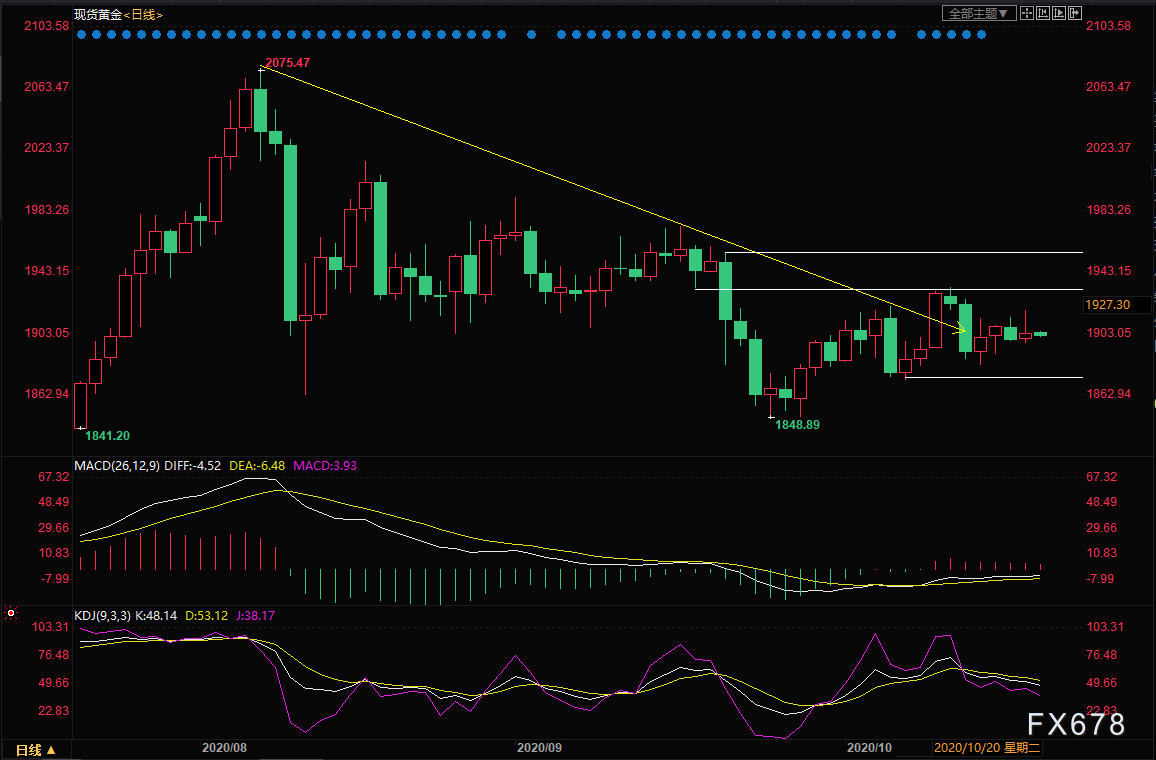 周二(10月20日)亚洲时段,现货黄金窄幅震荡于1900关口附近,隔夜因为市场担忧美国无法在大选前推出新一轮刺激计划,而且对新冠疫情的担忧有所升温,美国股市大跌逾1.5%创逾一周新低,对金价形成拖累;不过,新冠疫情使得全球多数央行偏向维持货币宽松政策,甚至是进一步扩大宽松;有迹象显示,拜登赢得大选的可能性增加,令美元承压,都给金价提供一些支撑。