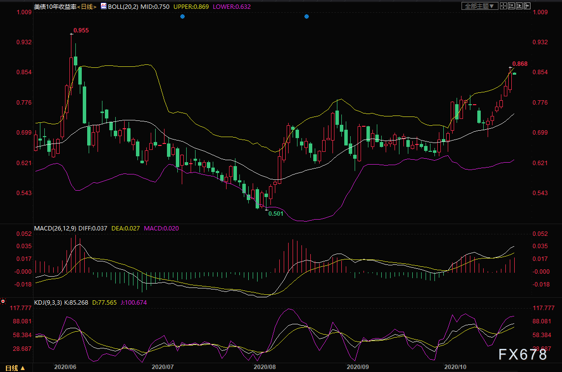 周四美国十年期债券持续上涨,日线级别六连阳,一度创近四个半月新高0.868%,这使得持有黄金的机会成本增加,促使部分投资者减少黄金资产配置。