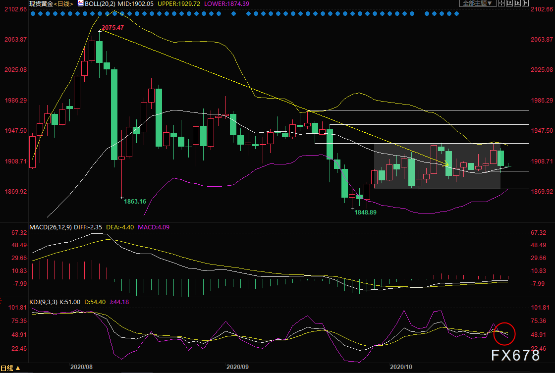 周五(10月23日)亚洲时段,现货黄金小幅下跌,最低跌至1901.41美元/盎司,因美元指数连续第二日走高;美国大选前出台新冠援助计划的希望减弱,全球新增新冠病毒感染病例激增,令美元得以触底回升。