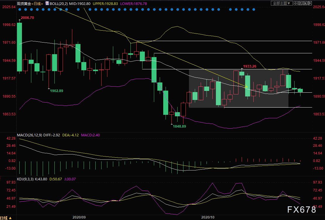 周一(10月26日)亚洲时段,现货黄金震荡走弱,盘初一度失守1900关口至1891.39美元/盎司,因上周美国两党刺激法案谈判一波三折,美国大选前达成协议的可能性进一步降低,另外上周末欧美新冠疫情进一步恶化,也给美元提供避险支撑,这令金价承压;不过,美债收益率周一走弱,美国大选前的不确定性仍给金价提供逢低买盘支撑。