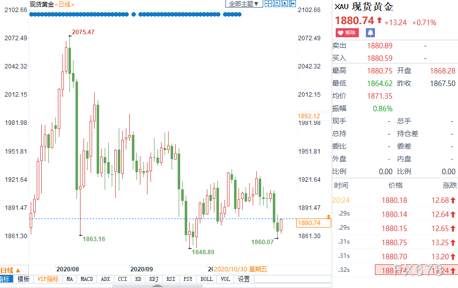 尽管9月非农数据发出强烈负面信号,美联储会议纪要显示利率将在长时间内维持低位,再加上美国总统大选形势的不确定性,金价一度冲高逾2.5%至1933.26美元;但美欧新一轮疫情来势汹汹,提升了美元的避险属性,金价岁回吐全部升幅并转跌。