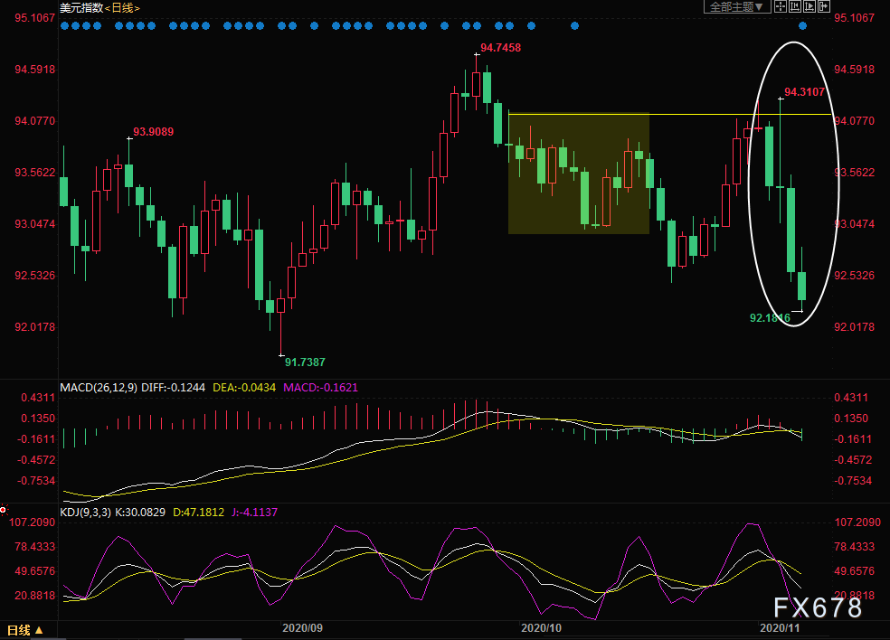 拜登在宾夕法尼亚州和乔治亚州扩大微弱领先优势,即将赢得总统宝座,因为市场普遍预期拜登会推出更大规模的刺激计划和更柔和的贸易政策,提升市场冒险情绪,美国三大股指均录得自4月以来的最大单周百分比涨幅,打压避险美元。美元指数本周震荡下跌,最低触及92.18,为9月3日以来新低,周线跌幅约1.82%,为3月底以来最大单周跌幅。