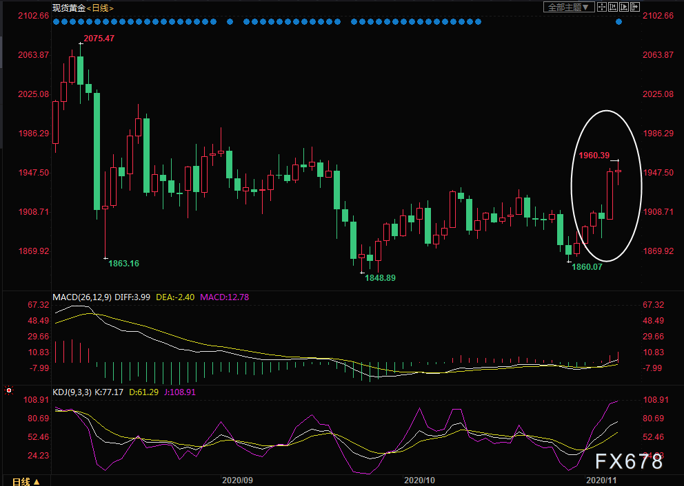刚刚过去的一周,现货黄金震荡走高,最高触及1960.39美元/盎司,为9月18日以来新高,收报1951.35美元/盎司,周线涨幅约3.9%,为7月底以来最大单周涨幅,一方面是拜登在美国大选中处于领先低位,市场憧憬更大规模的刺激计划,给股市提供上涨动能,打压美元的避险;另一方面,澳洲联储降息,英国央行扩大购债规模,美联储维持货币宽松,黄金因为有抵御通货膨胀的功能,买盘显著增加。