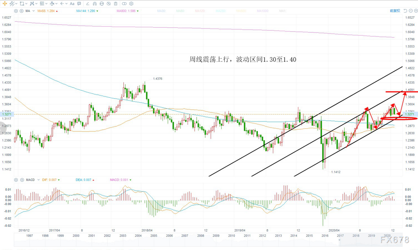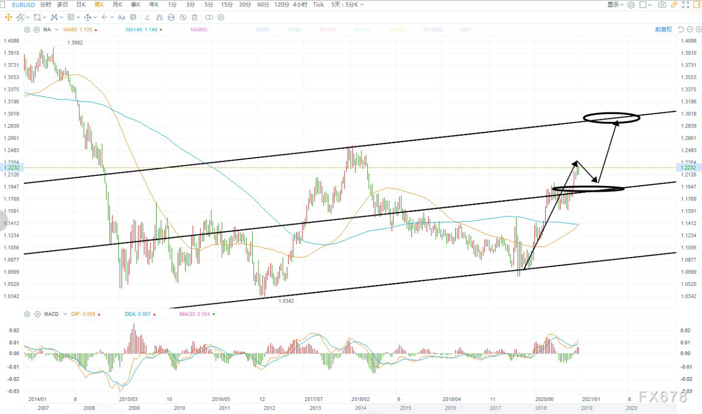 周线方面,目前斜率已经给出上涨结构,因此前期平台1.1950附近不再跌破的前提下由于突破水平箱体压力,给到通道上沿压力1.2900,此位置是周月线共振压力,很难突破。