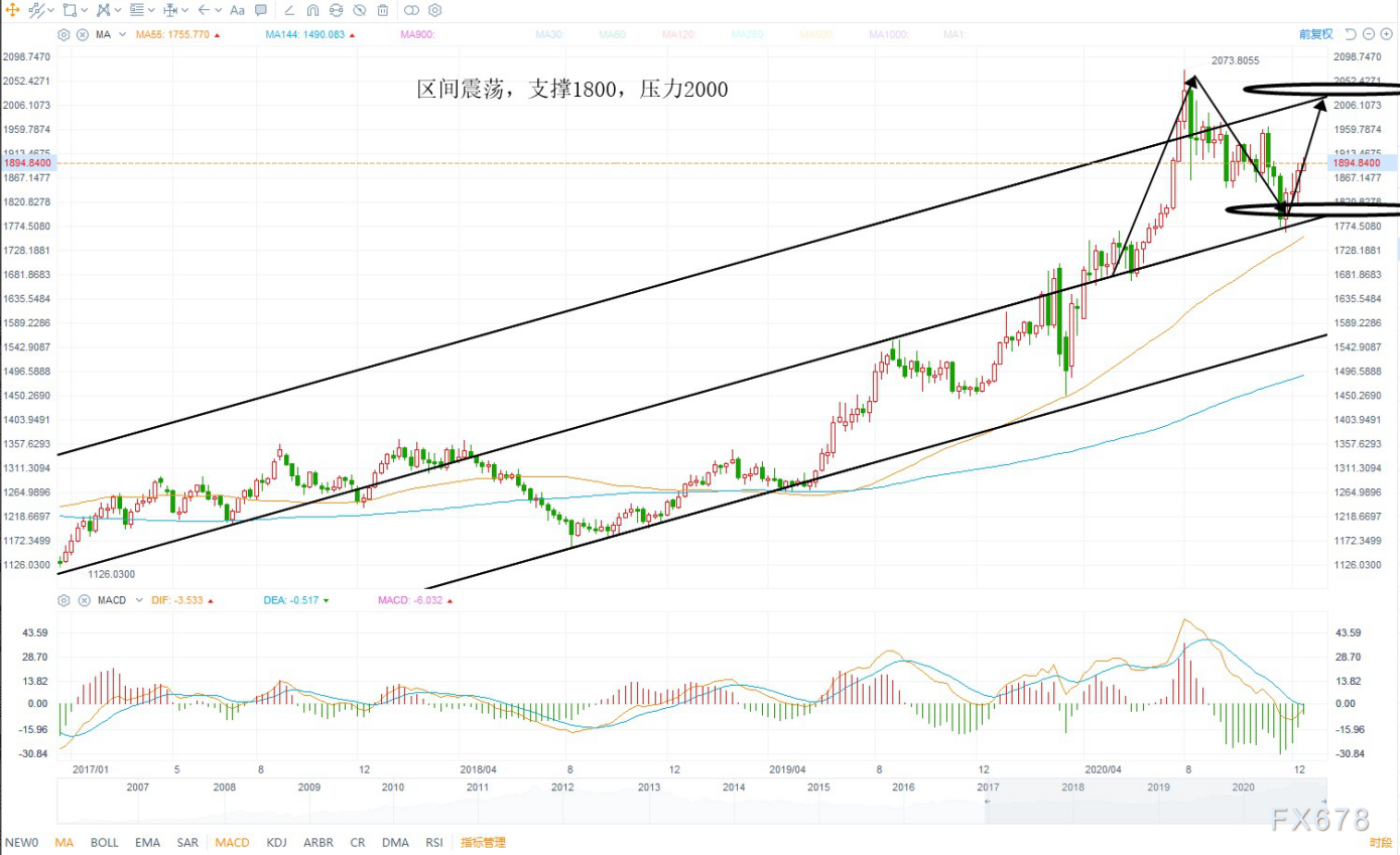 至于技术层面金价现在是属于周线级别回调,按照大区间震荡思路来看,2020年12月未能突破2000整数关口,总体还是以区间看待支撑1800,压力2000,这里属于周线级别加速之后的调整ABC,这个箱体如果突破则会出现加速5浪2021年目标看至2300美元上方。
