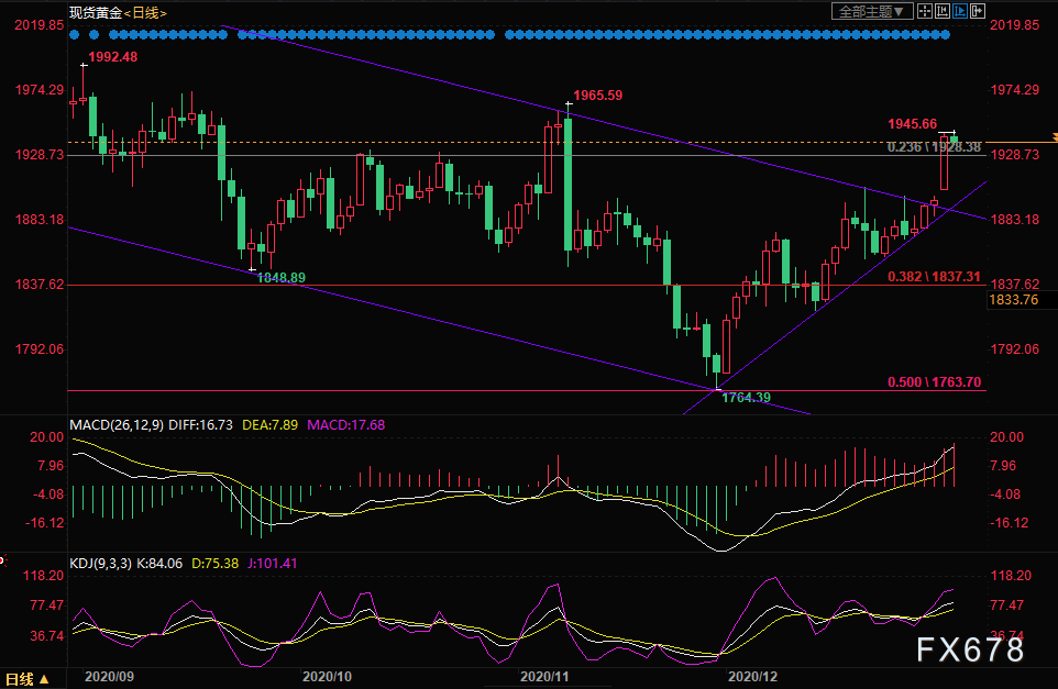 英国的再次封锁令英镑遭遇重挫,恐慌情绪升温,美国三大股指悉数下跌,道指收跌1.25%,标普500收跌1.48%,纳指收跌1.47%。标普500指数和道指创下去年10月底以来的最大单日百分比跌幅,纳指则创下12月9日以来的最大跌幅。这都为避险黄金提供上涨动能。