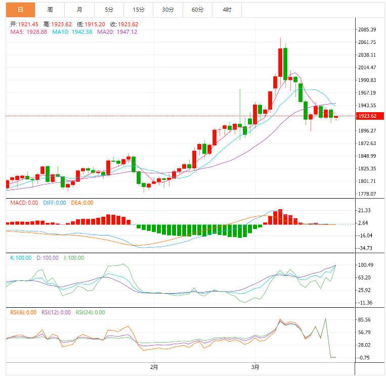 周三亚盘,现货黄金徘徊于附近,周二黄金下跌,现货黄金一度跌逾1%刷新近四个交易日低点至1910.60美元/盎司,因美债收益率上升,此前美联储主席鲍威尔就货币政策发表了鹰派评论。国债收益率继续攀升,短期国债可能创近四十年来最差季度表现。由于俄乌冲突,金价保持在每盎司1900美元上方;俄乌战争已经持续近一个月,没有停火迹象。随着大宗商品成本飙升,加剧通胀压力,投资者寻求保值避险。