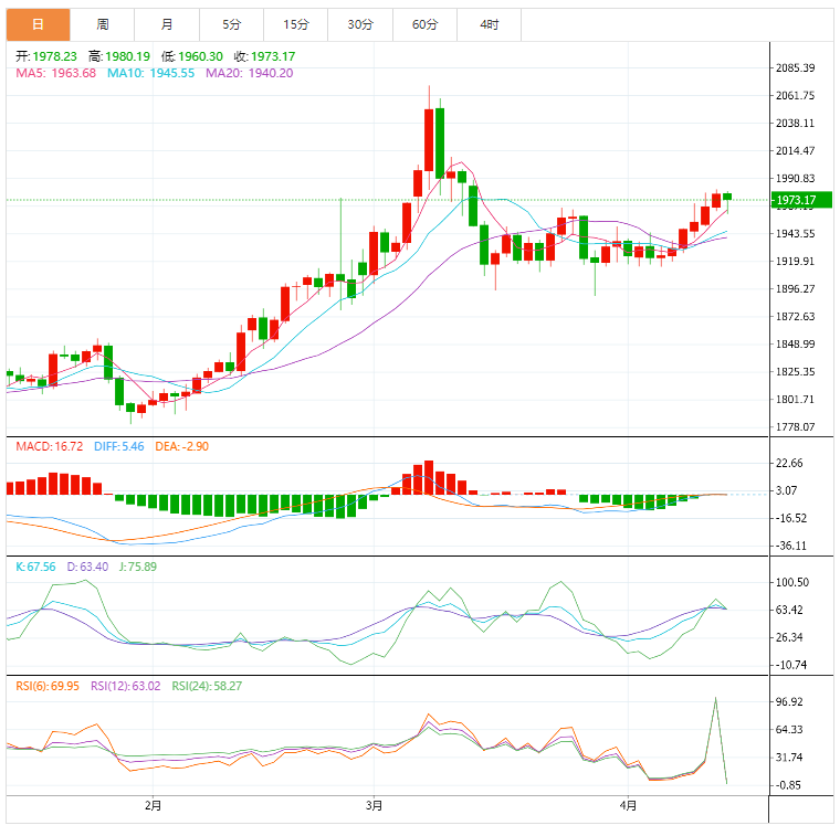 技术上,黄金本周依托1940支撑迎来强势的连续上涨,呈多头震荡上行趋势,一路狂奔1980关口,涨势非常带劲。随后多次冲击1980关口也未能逾越,代表高位有大量空头压力,不断在1970—1980关口反复震荡。今日复活节,警惕美盘空军趁虚而入,加上昨晚周线收官,容易出现多头获利回吐走势,毕竟本周连续的上涨还未出现有力的回调,另外多次冲击1980关口受阻,就有回调的继续,所以预期黄金将会出现回落,并且有望跌破1968欧盘低位。