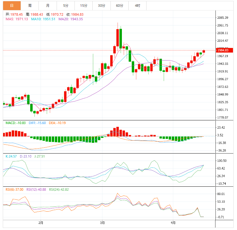 技术上,四小时级别上看,金价运行在均线上方,MACD金叉,KDJ金叉,均线多头排列,多头占据主动,任何后续突破1981-1982美元区域,都可能在1999美元区域附近遇到阻力,一周阻力位的枢轴点。下一个相关障碍是略高于2009美元的前期阻力位,也是上次下跌浪的的斐波那契38.2%回撤位。