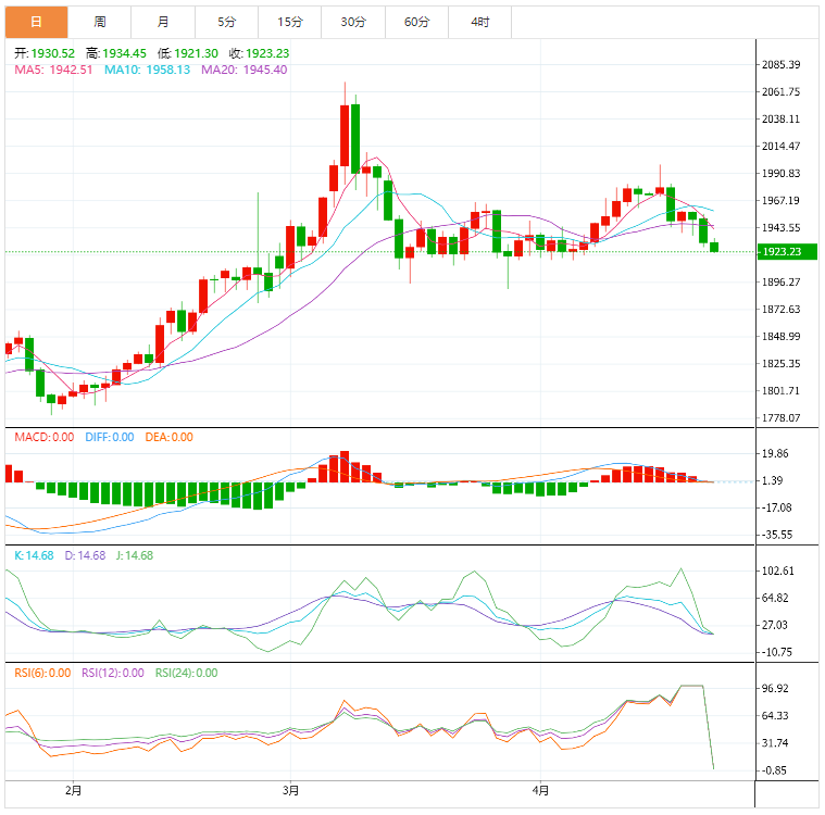 技术上,金价整理于从3 月29 日低点1,890.21 美元到上周高点1,998.43 美元趋势的61.8%斐波位1,931.56 美元附近。分别处在1,938.20 美元和1,944.56 美元的20 和50 周期指数均线正朝南,加大金价下跌倾向。同时相对强弱指标(14) 已进入20.00-40.00 看跌区间,这预示金价将展开新一轮看跌趋势。