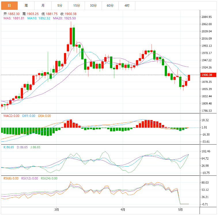 周四(5月5日)亚市早盘,现货黄金短线大涨,金价刚刚突破1900美元/盎司,日内涨幅达到近15美元;因美联储主席鲍威尔排除了单次加息75个基点的可能性,黄金价格大幅反弹,而隔夜美元指数在鲍威尔讲话后暴跌,周四亚市早盘美元指数承压于102.50附近。