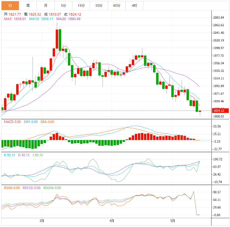 周五(5月13日)亚市早盘,现货黄金承压于1822美元/盎司附近,昨日金价大跌超30美元。因投资者押注美联储将继续大幅加息,纷纷涌向美元,周四黄金重挫。现货黄金收报1821.63美元/盎司,下跌30.71美元或1.66%。