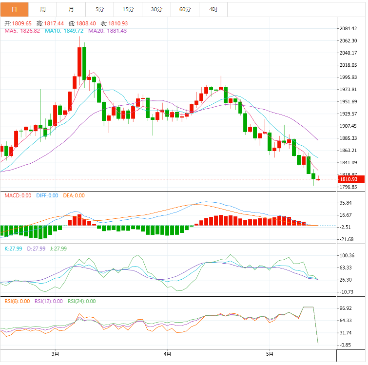 推动黄金下跌的主要因素是市场波动把投资者推向了美元,金价看起来有点超卖,每盎司1800美元附近可能会有实际支撑。