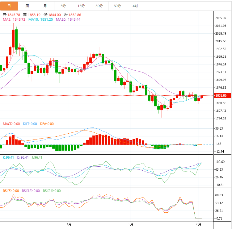 如果再次突破21日移动均线,将暴露出200日移动均线支撑位1841美元,跌破该支撑位的前一天低点1829美元将受到考验。在5月19日低点1,811美元之前,下一个下行目标在1820美元左右可能会受到威胁。