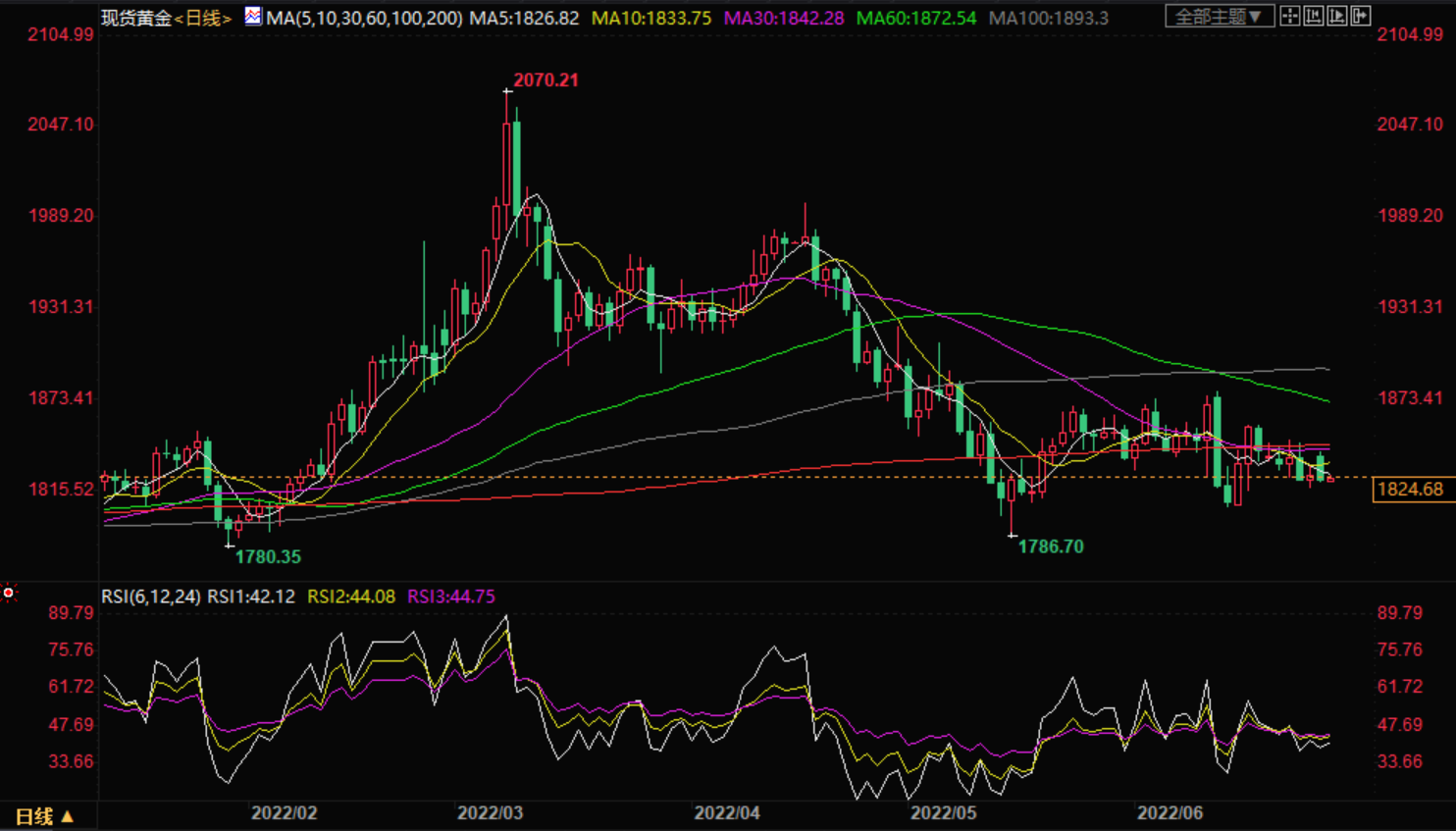 周二亚盘,现货黄金徘徊于1824附近,金价周一下跌,因利率上升而承压,投资者关注将在葡萄牙举行的欧洲央行年度论坛上任何有关政策动向的线索。OANDA高级分析师Edward Moya表示,“黄金走软,因在又一次需求疲软的美债标售后,债市再次遭遇抛售,从短期来看,黄金的前景好坏参半,今年夏天有很大的不确定性,一边是美联储更加激进的可能性,另一边是经济衰退的风险。美国10年期公债收益率攀升,令黄金的吸引力下降。