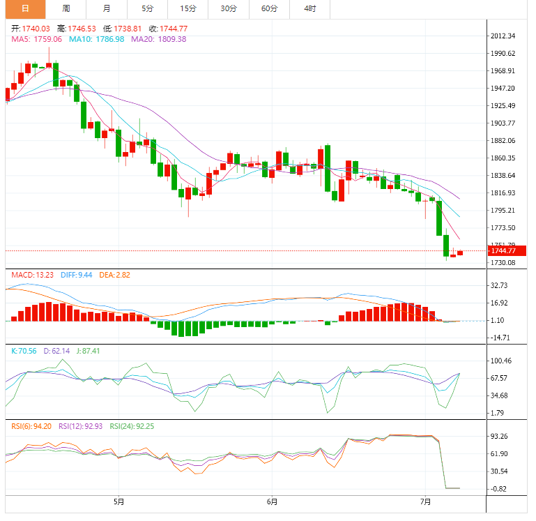 市场预计美国6月份非农数据不会特别靓丽,这有望给金价提供支撑,而且金价本周大幅走弱后也存在一定的修复需求,短线金价存在一定的反弹机会,但预计在收复10日均线1786.75(5月16日低点也在该位置附近)前,金价后市仍有进一步下跌风险,强势美元和加息前景将是制约金价反弹空间的“拦路虎”,下方重点关注1700-1721区域支撑。