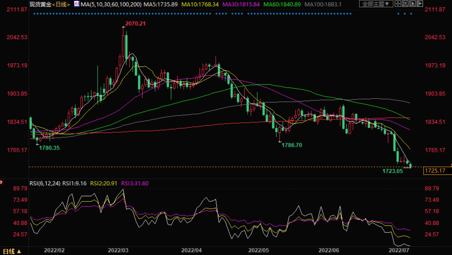 本周美国CPI数据可能会进一步走高,美联储官员一方面强化美联储7月加息75个基点,一方面淡化美国经济衰退风险,但欧元区经济衰退风险居高不下,美元存在进一步上涨机会,起码短线偏向维持强势,这令金价面临进一步下行风险,目前来看,试探1700-1721区域的可能性较大。而且近期强势美元较大程度的替代了黄金的避险作用,金价短线的反弹空间预计将受到限制。
