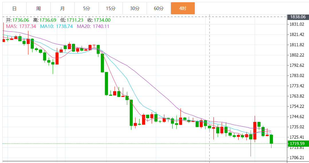 从4小时图来看,EMA 50指标继续支持金价延续看空走势。需要提醒的是,金价保持在1745.00美元/盎司下方对于实现上述看空目标相当重要。