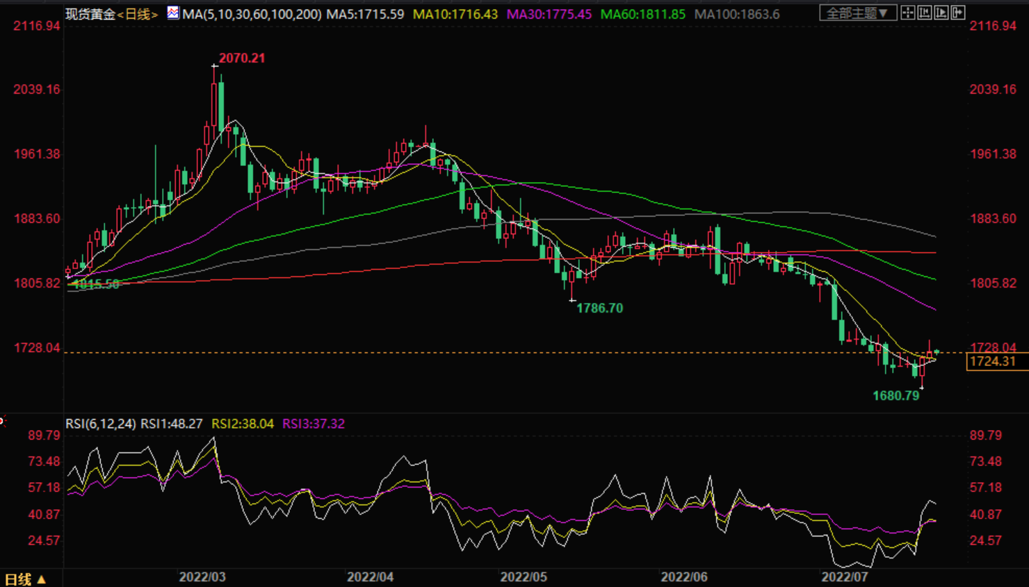 技术上,日线图显示,相对强弱指数(RSI)两周来首次攀升至30上方,表明黄金终于修正了超卖状况。技术面回升可能会持续到RSI达到50。上行方面,1750美元/盎司(20日移动平均线)构成首个阻力,然后是1780美元/盎司,这一水平是金价最新下行趋势的23.6%斐波那契回撤位与下行趋势线汇合之处。若金价日收盘价高于1780美元/盎司,可能被视为一个重大的看涨发展,并为金价进一步涨向1800美元/盎司打开大门。下行方面,1700美元/盎司(心理水平)形成关键支撑,更下方支撑在1680美元/盎司(7月21日低点)和1670美元/盎司。