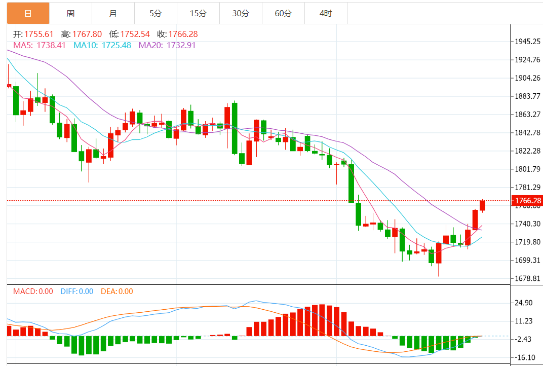 技术上,金价初步顶破了7月8日高点和布林线中轨1752.36附近阻力,短线看涨信号有所增加并有望加速上涨,后市有望进一步试探5月份低点1786.70附近阻力,甚至是55日均线1800关口附近阻力。短线的话,7月6日高点1772.73附近阻力也需要予以留意,2070-1680跌势的23.8%回撤位阻力也在该位置附近。
