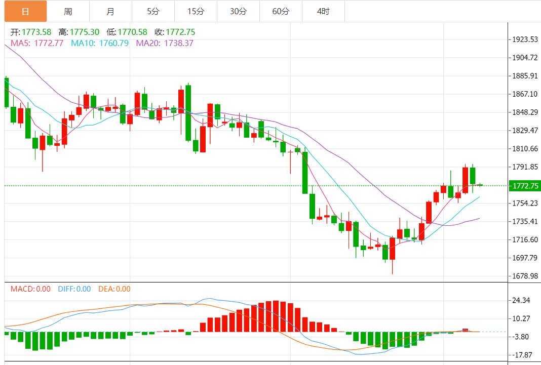 鉴于MACD金叉良好运行,在失守1752.36前,多头仍有机会,初步阻力在1780关口附近,继续关注55日均线附近阻力,目前在1793.33附近,如果能够顶破该阻力,则增加后市看涨信号;进一步阻力参考1800关口,然后是7月4日高点1714.16附近阻力。