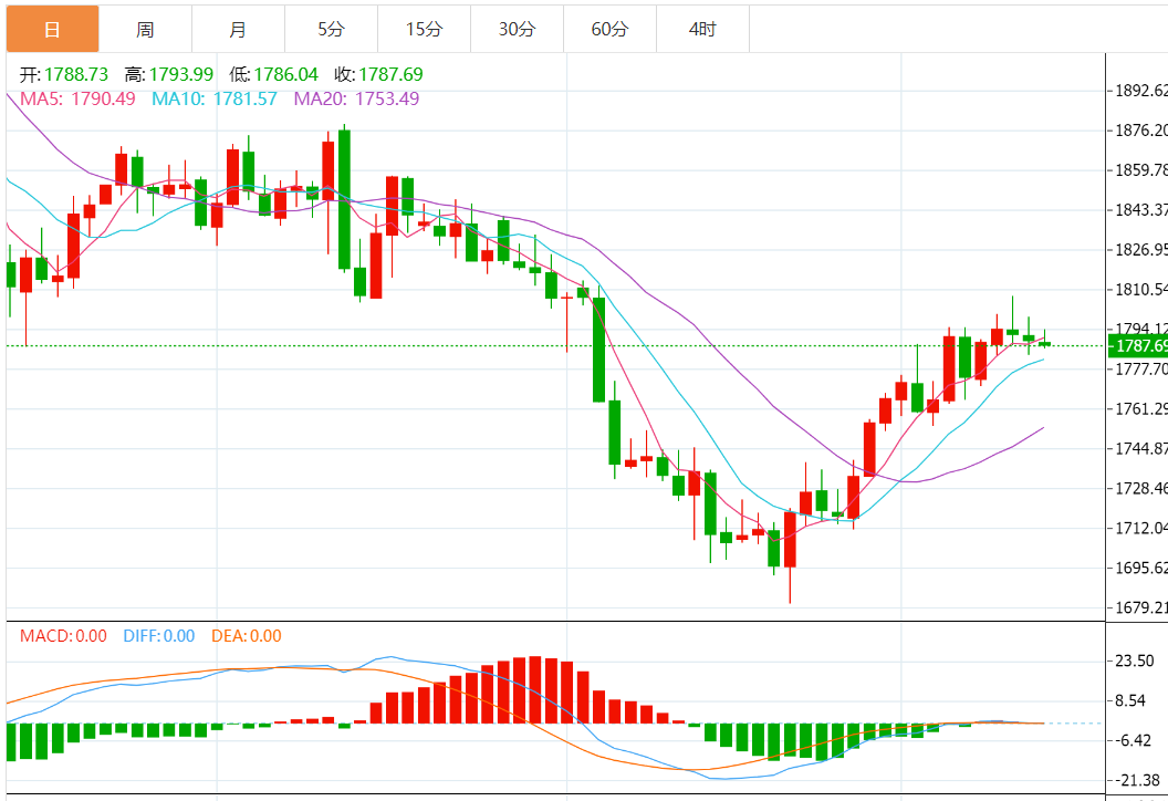 技术上,金价目前尚未有效上破55日均线阻力,布林线上轨之前也对金价形成了压制,KDJ相对高位轻微死叉,需要提防金价重回跌势的风险,10日均线支撑目前在1781.83附近,也可以参考1780关口支撑,在失守该位置前,短线仍偏向多头。