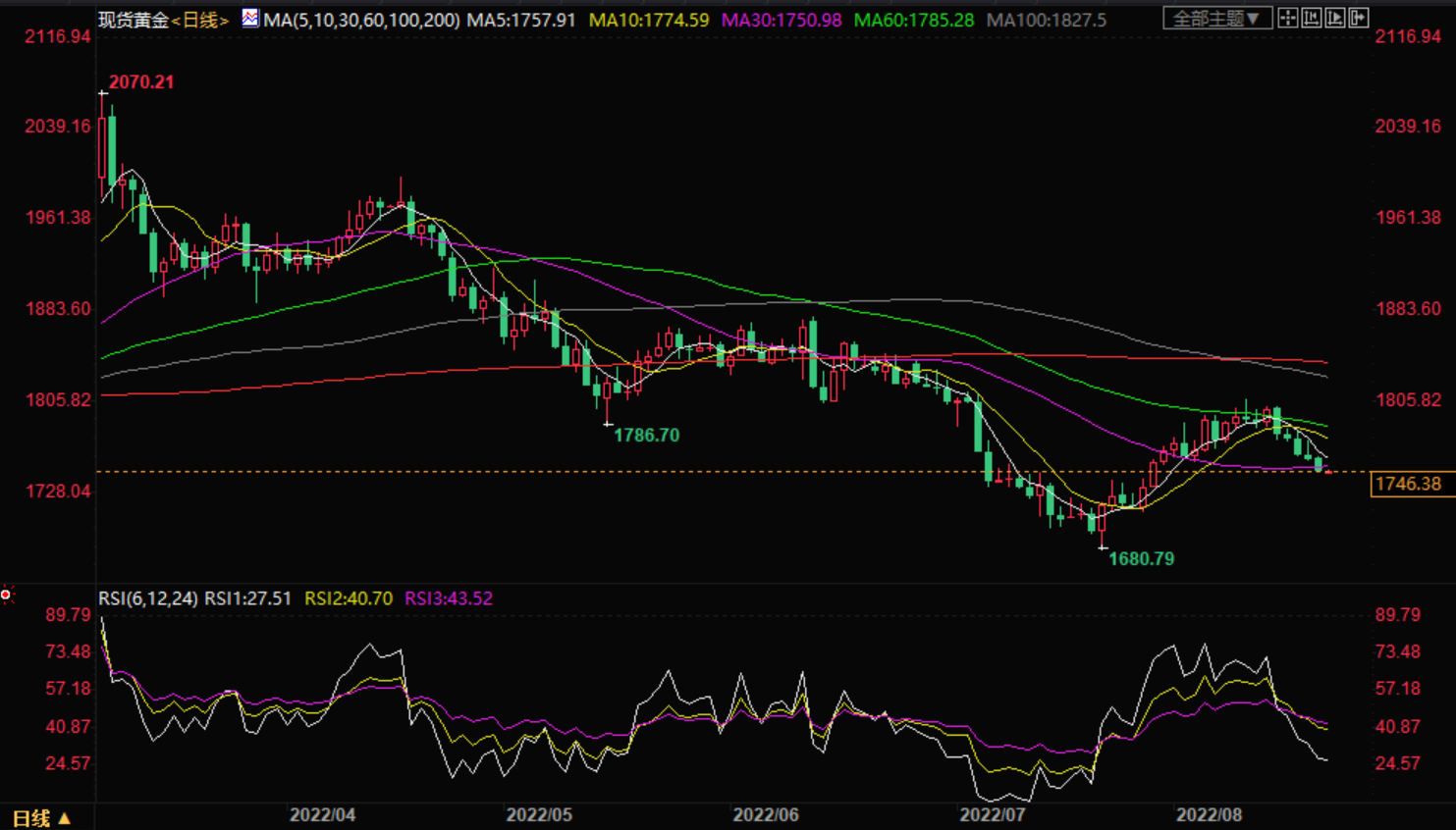 周一,现货黄金震荡微跌,一度创7月29日以来新低至1744.82美元/盎司,因上周美元持续走强,周一进一步升至逾一个新高,对金价打压明显。金价继创下月线高位1807.96美元连续五个交易日下跌。由于投资者因预期美联储释放鹰派指引而大幅减持黄金资产,因此金价可能会低于上述关键水平。